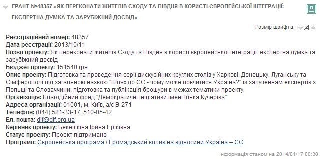 Идём дальше. Ого! “Фонд “Демократичні ініціативи” ім. Ілька Кучеріва”. Это же социологическая контора Ирины Бекешкиной, “последнего независимого социолога”! Как же, она же должна быть нейтральной! Ага, щас. Три гранта. Самый интересный — под названием ”Как убедить жителей Востока и Юга в пользе европейской интеграции: экспертное мнение и зарубежный опыт“. Нужны комментарии? Нет. Просто оставим это как факт. Социолог Ирина Бекешкина в октябре 2013 года получила от фонда Сороса 151 тысячу гривен на проект “Как убедить жителей Востока и Юга в пользе европейской интеграции”, а в январе 2014 года подписалась против законопроекта, который заставит её в будущем открыто сообщать общественности о подобном. В этой фразе есть хоть слово неправды? Или, может быть, какая-то манипуляция или передёргивание фактов?