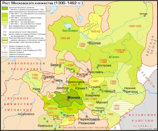 А Москва в это время, готовясь к схватке с Ордой, постепенно, как видно из карты ниже, отвоевывала и присоединяла к себе исконно русские земли. Сначала были присоединены Верховские княжества (название связано с нахождением в верховьях Оки), образовавшиеся в результате распада Черниговского княжества - сегодня это Тульская и Калужская области. Позже дойдет очередь и до земель, составивших нынешние Орловскую, Брянскую и Курскую области. Но о какой московской оккупации даже части Черниговского княжества может идти речь, если его к тому времени давно уже не было?