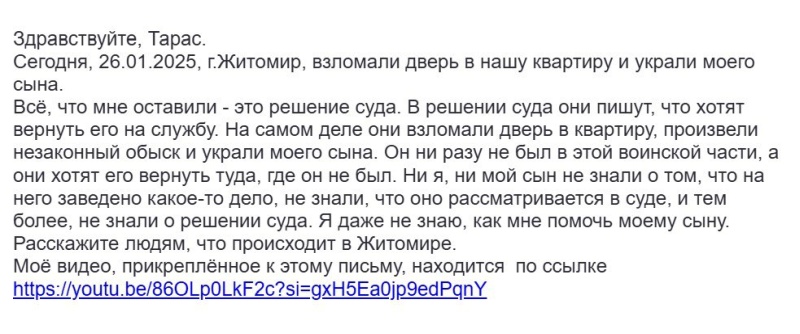 По сообщениям граждан, сотрудники ТЦК приходят с документами, которые выглядят как судебные постановления, и используют их для проникновения в квартиры. Родственники похищенных таким образом мужчин утверждают, до визита военкомов никаких официальных уведомлений о судебных разбирательствах или решениях суда они не получали.
