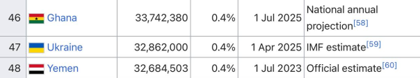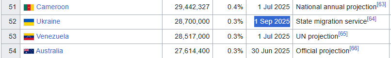 26 января этого года Википедия переместила Украину с 47 места (32,8 млн) на 52 место (28,7млн) в списке стран мира по населению.