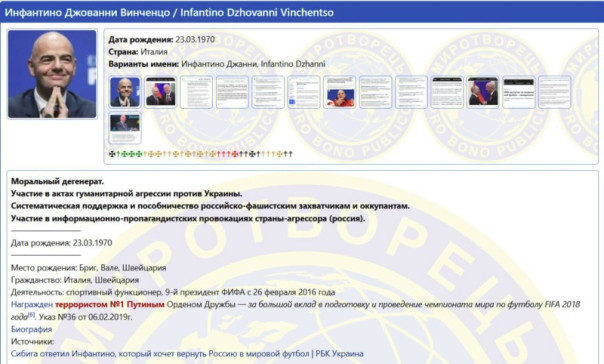 Президент FIFA Джанни Инфантино внесен в базу украинского экстремистского сайта «Миротворец». Ему вменяется участие в актах «гуманитарной агрессии» против Украины и в «информационно-пропагандистских провокациях».