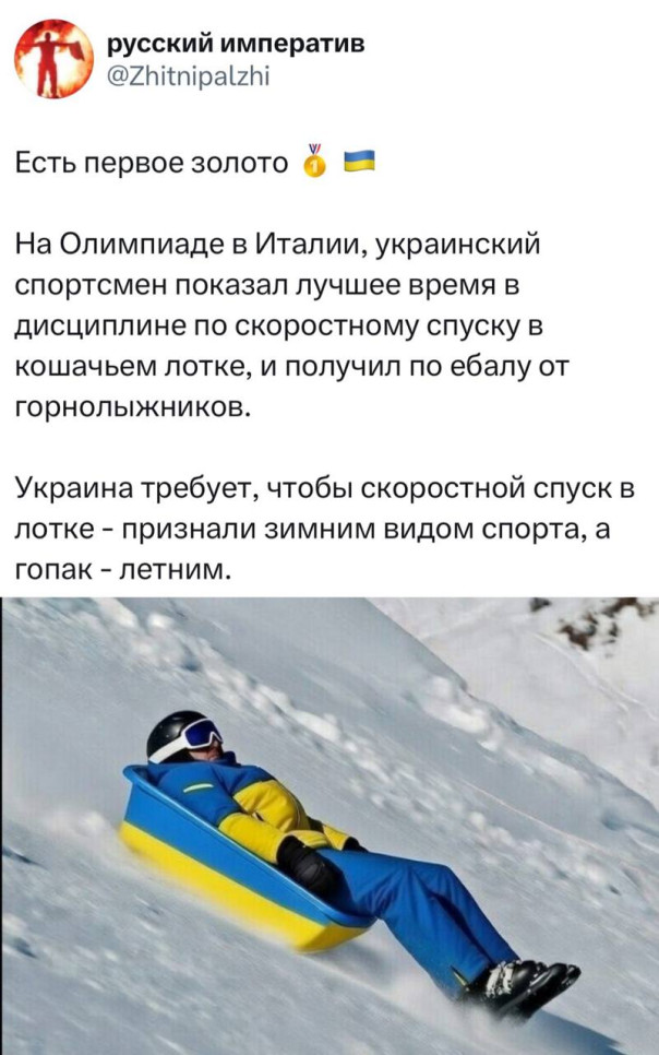 Так вот, бобслеист хохол Гераскевич на предварительные заезды выходил в шлеме с фотками загинувших захыстников-спортсменов, несмотря на существующий запрет политической рекламы и пропаганды.