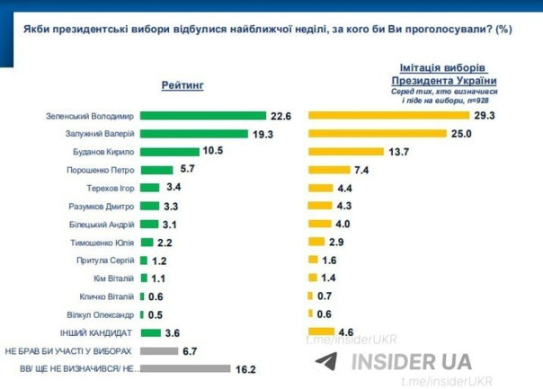 Согласно соцопросу Socis, проведенного в конце марта, Владимир Зеленский сохраняет лидерство с результатом 22,6%. Далее следуют Валерий Залужный (19,3%) и Кирилл Буданов (10,5%), что уже выводит последнего в число заметных политических игроков.