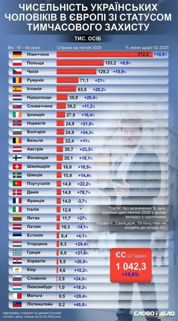Кроме того, целый ряд «патриотов» и военных очень рассчитывают на армию мужчин (наверняка затем – и женщин), которые сегодня находятся на территории Европы, в социальных сетях распространяется таблица с указанием, в какой стране сколько украинских мужчин мобилизационного возраста, причем считали мужчин от 18 до 64 лет, хотя официально мобилизации подлежат граждане с 25 до 60 лет.