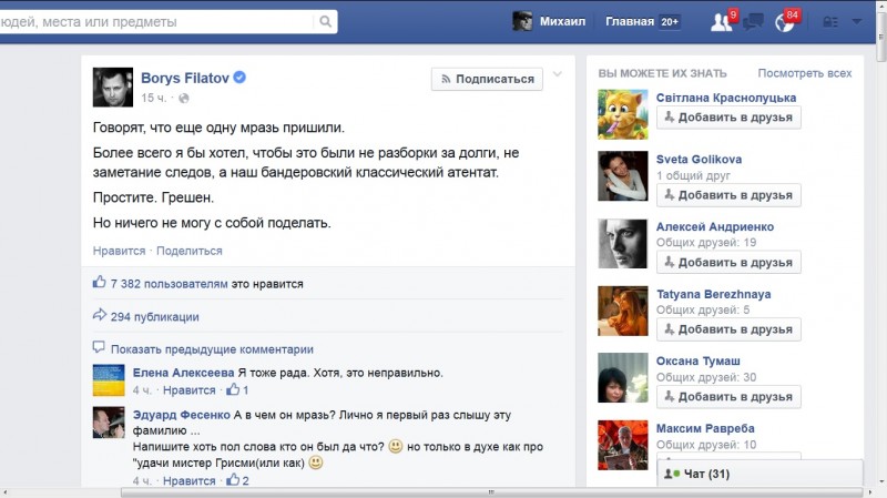 Я с отвращением наблюдал в социальных сетях и на украинских сайтах ту радость и восторг, которые, в маленьких и убогих душах «свидомых», вызвала смерть ещё одного ни в чём не повинного человека.