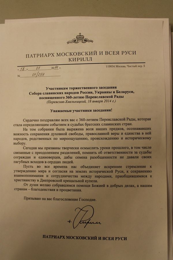 В начале работы Собора сопредседатель с украинской стороны академик Петр Петрович Толочко, который является членом Патриаршего Совета по Культуре, зачитал приветствие к участникам Собора Святейшего Патриарха Московского и Всея Руси Кирилла: