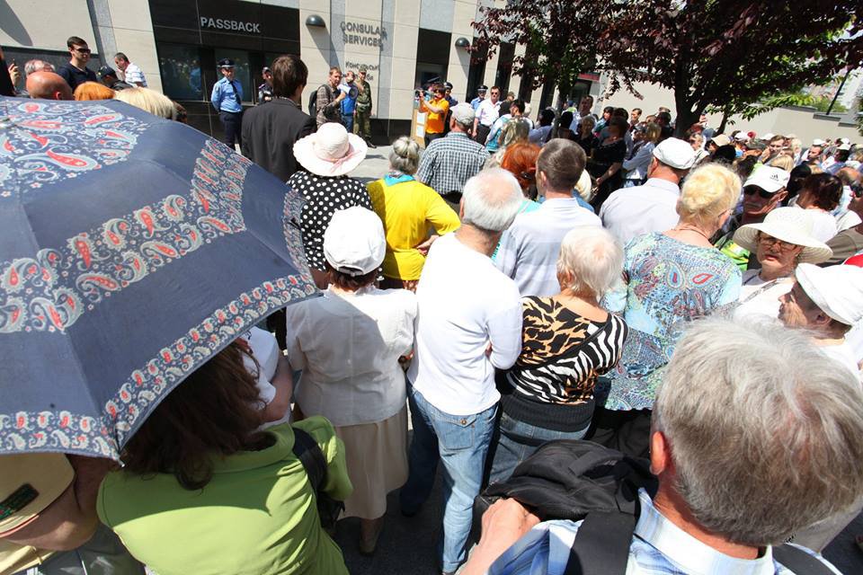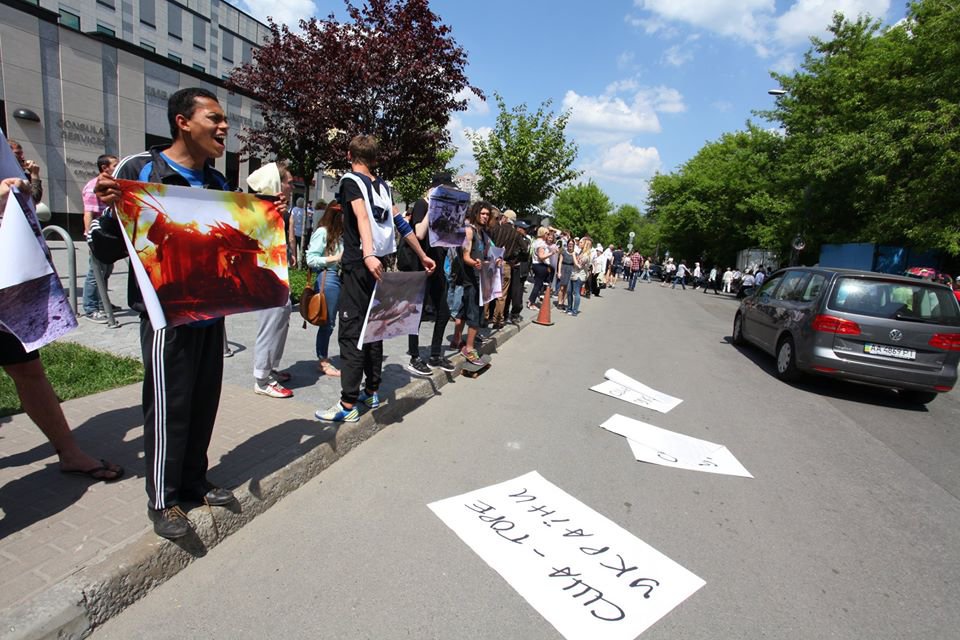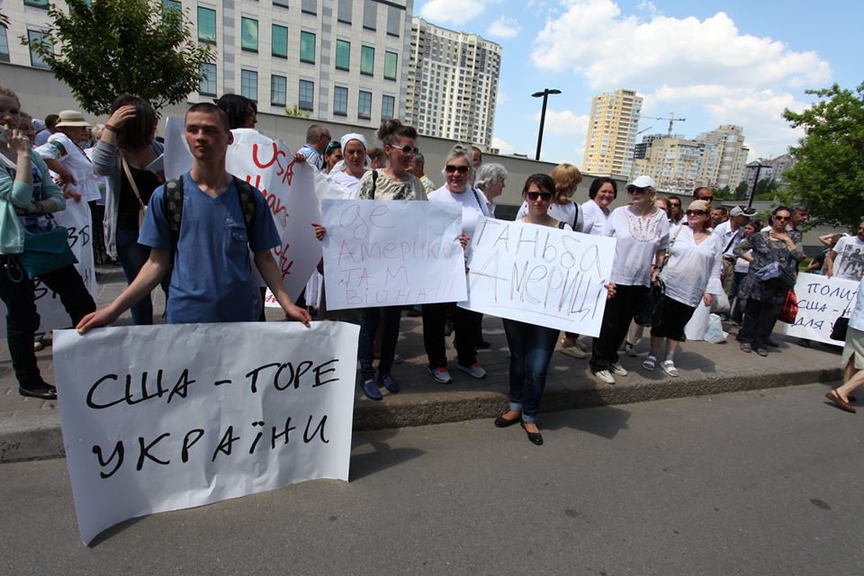 Люди кричали: "Позор!", "США! Руки прочь от Украины!", "США - убийцы Украины!". СБУ как могло успокаивало организаторов, угрожая отправкой в зону АТО, арестами и преследованиями. Было предпринято несколько попыток собраться всем участникам у входа в посольство с перекрытием дороги, но каждый раз милиция и СБУ оттесняли людей обратно на тротуар.