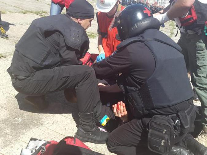 В Киеве члены нацистской организации «Правый сектор» напали на участников гей-парада.Но в результате осколком петарды в шею ранен почему-то милиционер.
