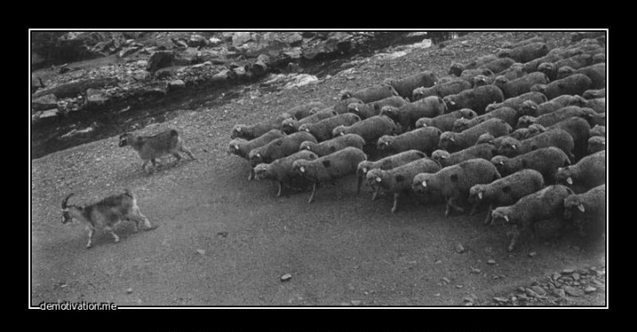 Это стадо баранов. Они идут через ворота. Идут через ворота, несмотря на то, что никакого забора нет. Так работает стадный мозг барана. Точно так же, как у других баранов. Они существуют только как стадо, но не по отдельности. В них нет индивидуальности. Нет самостоятельности.