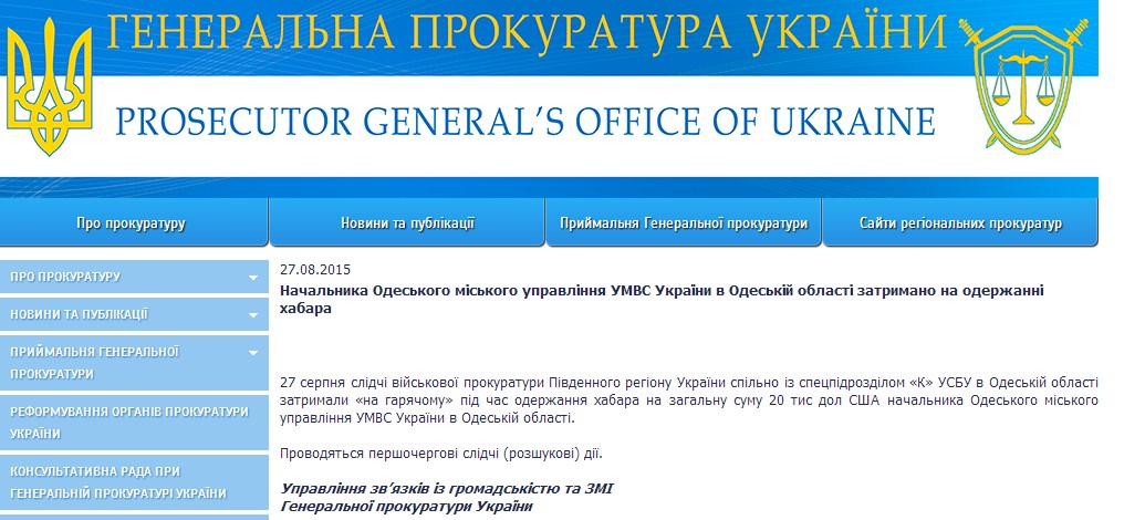 КИЕВ, 27 авг — РИА Новости. Начальник Одесского городского управления МВД Украины в Одесской области задержан на получении взятки в 20 тысяч долларов, сообщает в четверг пресс-служба генеральной прокуратуры Украины.