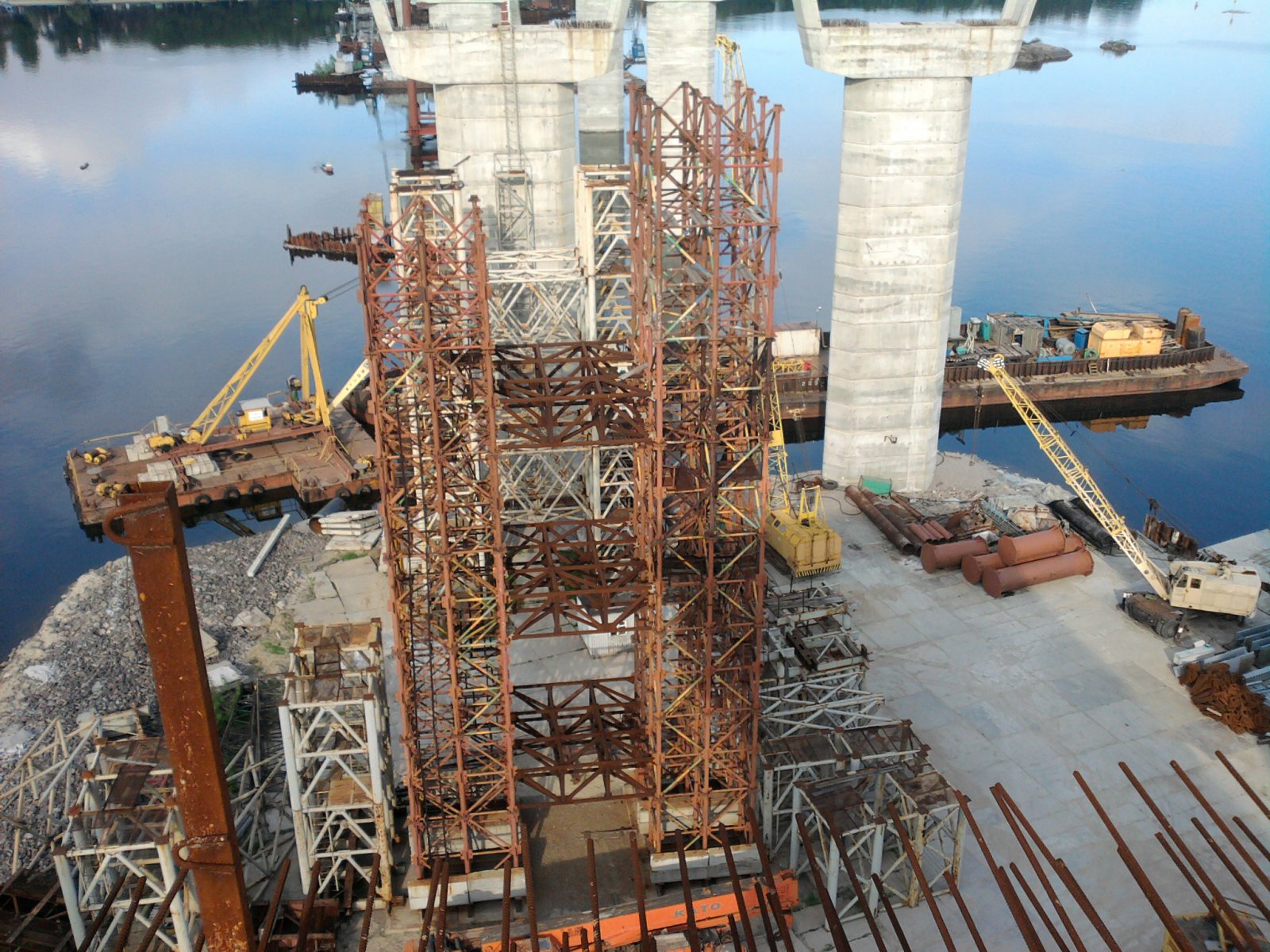 Последний раз на недостроенных мостах я был весной 2014 года. Уже тогда сторож замороженного объекта, бывший перед этим строителем этих мостов, с горечью показывал на сотни метров проржавевшей сваренной арматуры, которая должна была стать основой для заливки бетоном, и говорил, что согласно технологии заливать бетоном нужно сразу, а теперь придется всю эту проржавевшую арматуру срезать и варить по-новому. А еще он рассказал, как потихоньку разворовывается строительное оборудование и материалы. Вот фотографии, сделанные мной в то посещение: