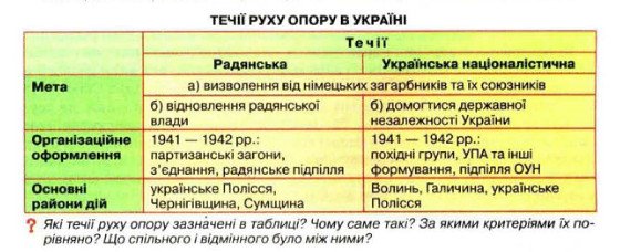 Таблица из учебника «Истории Украины» О.Пометун и Н.Гупан, иллюстрирующая существование двух течений в движении Сопротивления оккупационному режиму в годы Великой Отечественной войны на Украине.