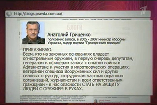 Экс-руководитель министерства обороны Украины Анатолий Гриценко в субботу, 25 января, выступил с призывом патрулировать улицы Киева и применять легальное оружие в защиту митингующих на Майдане.