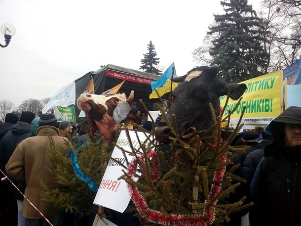 Участники митинга пришли на акцию с флагами Аграрной партии и Федерации профсоюзов. Митингующие принесли под Раду елки с отрезанными головами коров в знак протеста против действий властей страны.