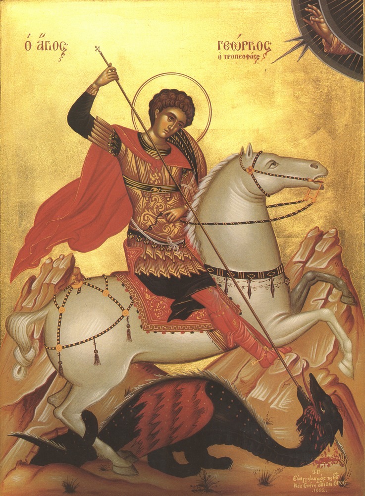 Собраннии в храме твоем и пред иконою твоею святою поклоняющийся людие, молим тя, известный желания нашего ходатаю, моли с нами и о нас умоляемаго от своего благоутробия Бога, да милостивно услышит нас, просящих Его благостыню, и не оставит вся наша ко спасению и житию нуждная прошения, и дарует стране нашей победу на сопротивныя; и паки, припадающе, молим тя, святый победоносче: укрепи данною тебе благодатию во бранех православное воинство, разруши силы востающих врагов, да постыдятся и посрамятся, и дерзость их да сокрушится, и да уведят, яко мы имеем Божественную помощь, и всем, в скорби и обстоянии сущим, многомощное яви свое заступление. Умоли Господа Бога, всея твари Создателя, избавити нас от вечнаго мучения, да прославляем Отца, и Сына, и Святаго Духа и твое исповедуем предстательство ныне, и присно, и во веки веков. Аминь.