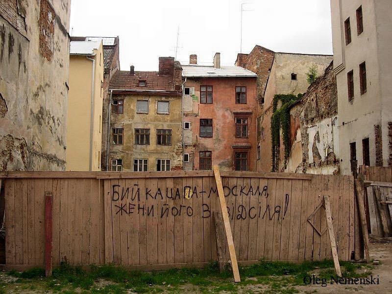 Но вместо того, чтобы заложить дыры кирпичом, обновить штукатурку, покрасить, застеклить окна – пишут «антимоскальские» надписи на заборах. Да и сам забор постепенно приходит в плачевное состояние, скоро негде будет писать про «злых кацапов».