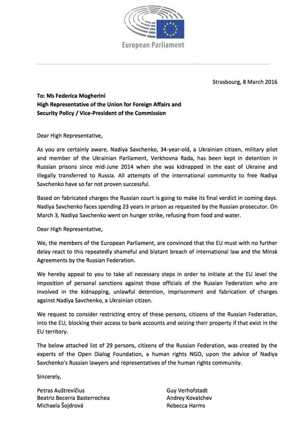 Письмо, подписанное 57 парламентариями, перечисляет тех, кто, по мнению евродепутатов, "ответственны за политическое решение о похищении Савченко, транспортировке ее на территорию России, незаконное ее задержание и предъявление сфабрикованных обвинений". Также, по мнению политиков, санкции следует наложить на тех, кто ответственен за "легитимизацию действий России в глазах мирового сообщества".