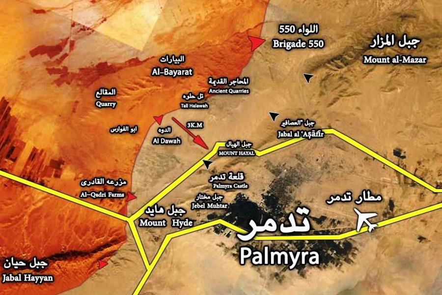 Сирийская армия начала наступление на северные предместья Пальмиры в понедельник, пытаясь продвинуться к бывшему штабу 550-й бригады с позиций у каменоломен Древней Пальмиры, за которые ещё недавно, до успехов правительственных войск в районе Эль-Байярат, с переменным успехом шли бои.
