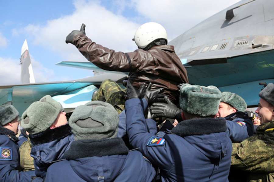 Во вторник, 15 марта, первая группа бомбардировщиков Су-34, совершившая перелет с авиабазы Хмеймим, прибыла на авиабазу Западного военного округа в Воронежской области. А накануне, 14 марта, согласно сообщениям информационного агентства Al Masdar News, российская авиация уничтожила несколько сотен туркоманских боевиков в лесах Фиринлик на севере Латакии, нанеся в понедельник во второй половине дня ряд авиаударов близ турецкого города Яйладагы. Впрочем, по сообщениям того же агентства, и на следующий день — во вторник, 15 марта, ВКС России продолжили нанесение авиаударов по позициям боевиков в Сирии.