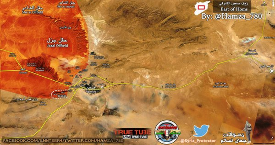 На востоке провинции Хомс спецподразделение Сирийской Арабской Армии «Тигры» во взаимодействии с бригадой «Ястребы пустыни» установило полный контроль над высотой 853, лежащей к западу от Пальмиры, после тяжелого боя с боевиками «Исламского Государства» (организации, запрещенной на территории РФ).