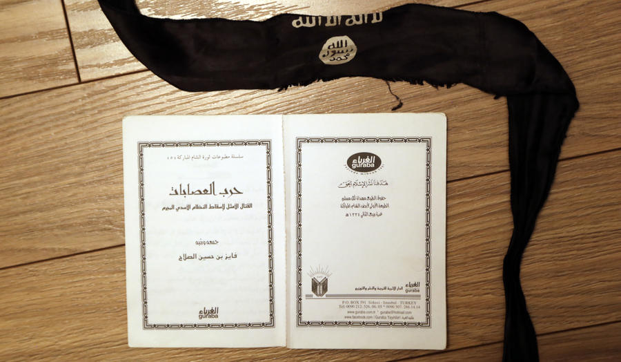 Брошюра под названием «Лучшие способы ведения боевых действий для свержения преступного режима Асада», отпечатанная в Стамбуле, и флаг «Исламского государства»