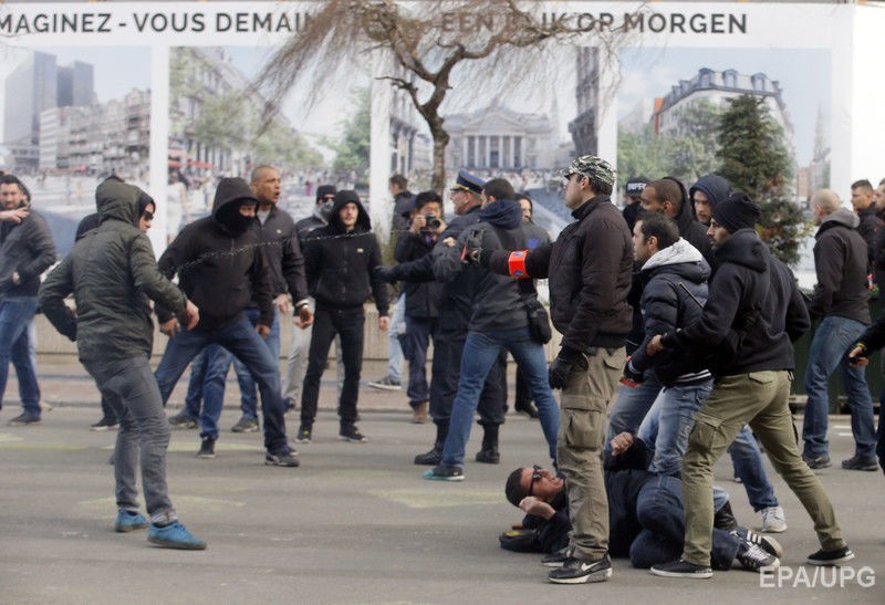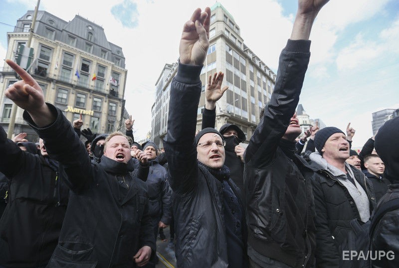 Но одновременно с этим поднимает голову Брюссель совершенно иной - старая привычная фашистская Европа. 27 марта в Брюсселе произошли столкновения, как пишут толерантные СМИ, между полицией и радикально настроенными демонстрантами (около тысячи), которые выступали против террористической организации "Исламское государство". Радикально настроенные демонстранты - это правые силы, попросту неонацисты. Вот они: