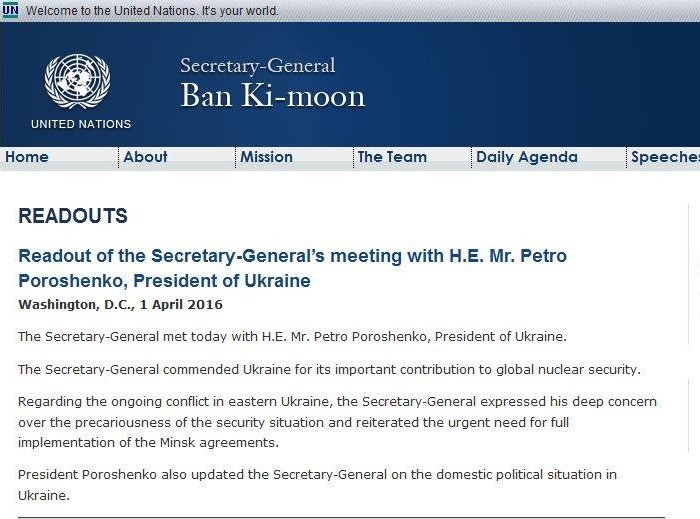 Так, на сайте ООН можно найти лишь краткое упоминание о Порошенко, в котором выражается благодарность Украине за усилия в области ядерной безопасности. В отношении конфликта на Востоке страны сайт ООН кратко констатировал обеспокоенность в связи с ситуацией с безопасностью, а также необходимость соблюдения Минских соглашений.