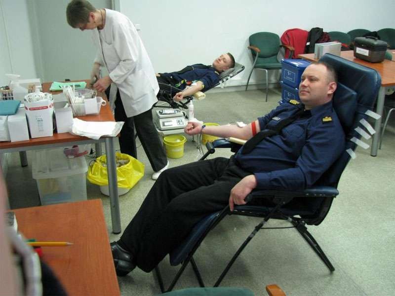 На фото - военнослужащие военно-морских сил Литвы на станции переливания крови