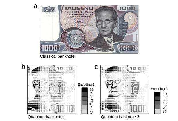 Установление подлинности: составление секретного описания квантового состояния для каждой купюры. Секрет кодировки не разглашается в целях обеспечения безопасности.