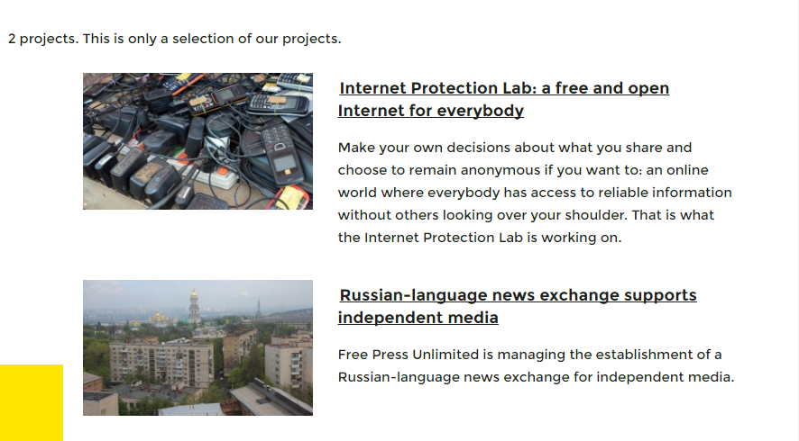 В настоящее время на территории РФ у организации два проекта: «Свободный и открытый интернет всем» и тот самый русскоязычный новостной центр по поддержке независимый СМИ.