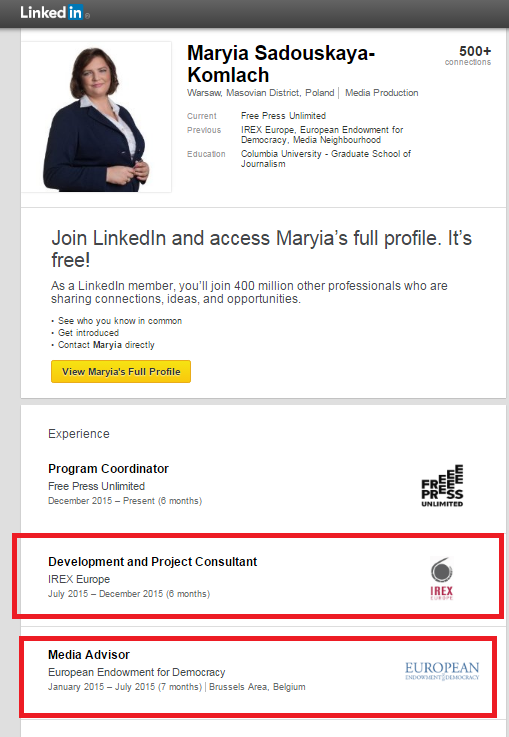 Однако как только речь заходит о конкретных методах работы и о спонсорах, куратор «обмена» предпочитает многозначительно промолчать. Но мы, дотошные журналисты, конечно, не ищем легких путей. Вообще сначала следует обратить внимание на саму персону Садовской-Комлач, благо, у нее есть отличная страничка в соцсети «LinkedIn»: