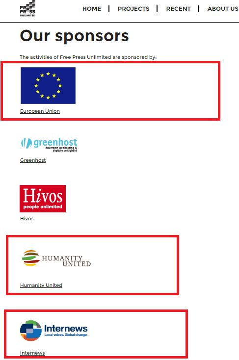 Университет Амстердама отстаивает позиции министерства образования Нидерландов, которое курирует деятельность учреждения, и грантодателей, среди которых есть «Открытое Общество» Сороса и фонд Рокфеллера. Поскольку МИД и университет – это структуры самые что ни на есть государственные, конкретно стоит остановиться на некоммерческой организации Free Press Unlimited (FPU).