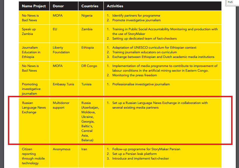 Как следует из планов на 2016 год Free Press Unlimited, новый проект русскоязычного новостного центра будет распространяться на 7 государств и финансироваться сразу из нескольких карманов щедрых людей. Конечно, их имена никто пока не называет.
