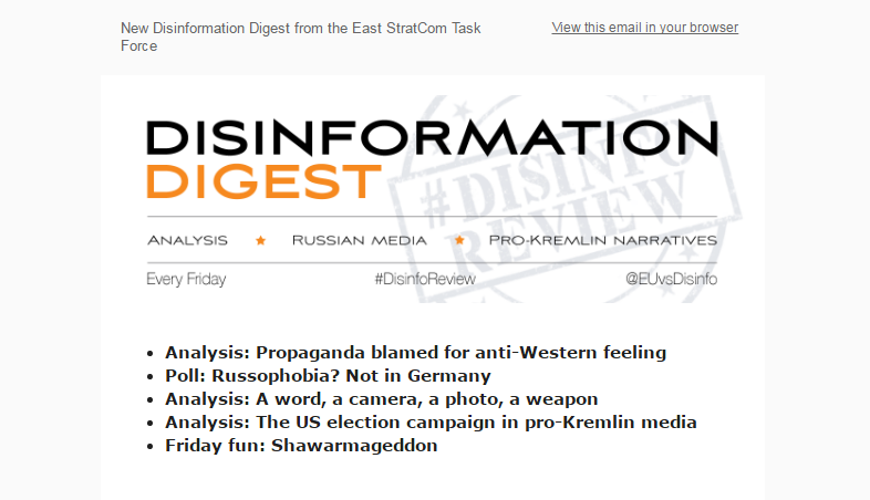 Каждую неделю «стратеги» из Североатлантического альянса внимательно мониторят российскую прессу и телеканалы в целях извратить суть новостей и аналитических статей так, чтобы позже подать это в своем еженедельной обзоре Disinfo Review: позже, кстати, этот же извращенный материал переходит украинцам в дочернем проекте StopFake.org, известном своими скандальными и нелепыми «разоблачениями».