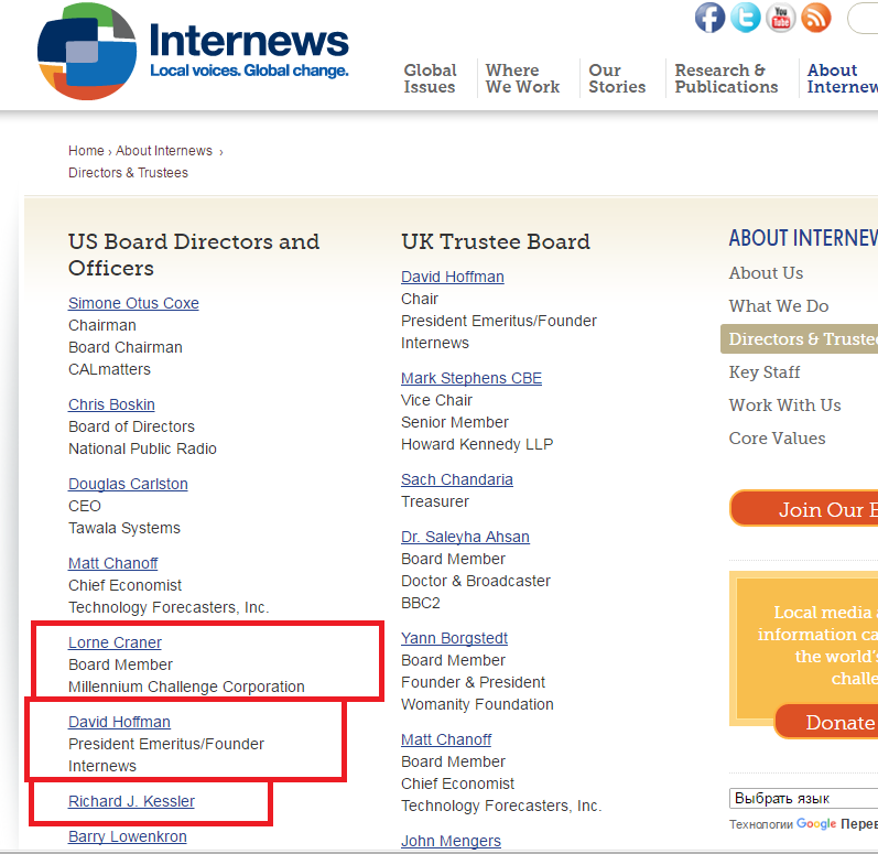 И есть, например, такая интересная контора как Internews, чья «миссия заключается в расширении возможностей местных средств массовой информации по всему миру». Таким образом, НКО хочет дать людям новости и информацию, «необходимые им», и сделать так, чтобы голоса этих местных СМИ были услышаны. Internews входит в сеть Internews Network, которая напрямую финансируется из Госдепартамента США. И европейское отделение, и центральное (в Вашингтоне) непосредственно спонсируется, как европейскими правительствами и фондами, так и американскими. Как пишут на сайте, с момента распада СССР «необходимо было внимание переключить» именно на восточно-европейский регион, именно потому на русскоязычные проекты выделяются огромные средства. В совете директоров двух региональных ячеек компании сидят почти одни и те же люди, которые в свое время отличились успехами на государственных постах в США или НАТО.