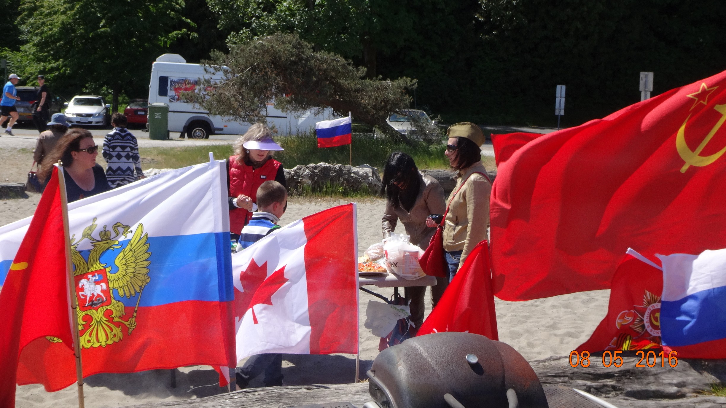 Как и в прошлом году, маршрут был выбран тот же самый, из Ричмонда до Spanish Bank. На каждой машине был флаг либо СССР, России и даже флаг Победы, некоторые активисты ехали в пилотках образца войны.