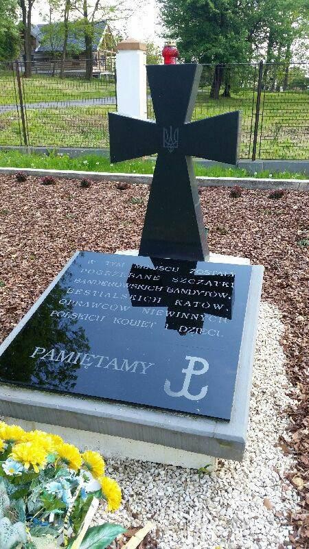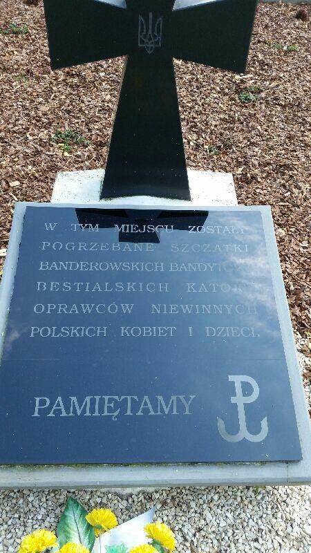 Польские националисты заменили текст на табличках: «В этом месте были захоронены останки бандеровских бандитов — жестоких мучителей невинных польских женщин и детей. Помним». На табличке также размещён польский якорь — символ борьбы за освобождение.