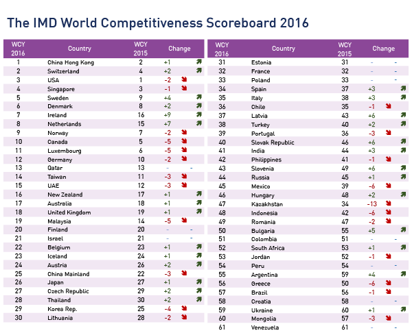 Позиции России в рейтинге изменились, страна поднялась с 45-го на 44-е место. Эксперты IMD в качестве сильных сторон российской экономики отмечают состояние государственных финансов, налоговую политику и рынок труда.