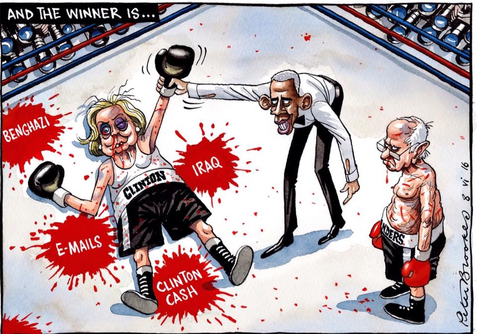 Данную ситуацию издание «Таймс» обыграло в едкой карикатуре, на которой Хиллари и Берни изображены в качестве боксеров на ринге. Экс-госсекретарь, при этом, лежит, распластавшись на ринге, а сенатор Сандерс стоит на своих ногах. Тем не менее, «судья» с лицом Барака Обамы поднимает вверх руку лежащей Клинтон, обьявляя о ее победе.