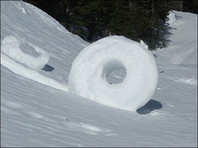 Дети любят играть в снежки и лепить снеговиков, но у природы есть свой способ играть в снежки! При определенных погодных условиях, когда часть снега падает вниз, а часть сдувается ветром, образуются вот такие милые пончики.