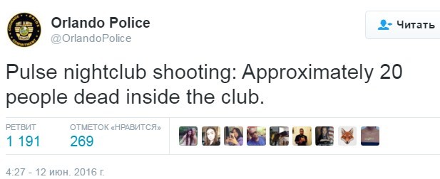 Минувшей ночью неизвестный мужчина устроил стрельбу в гей-клубе Pulse, в котором находилось около сотни посетителей — все они были гостями тематической латиноамериканской вечеринки. Изначально поступали сообщения о том, что там были ранены 25 человек, захвачены заложники, а преступник якобы готовится взорвать бомбу. ФБР уже назвало случившееся террористическим актом.