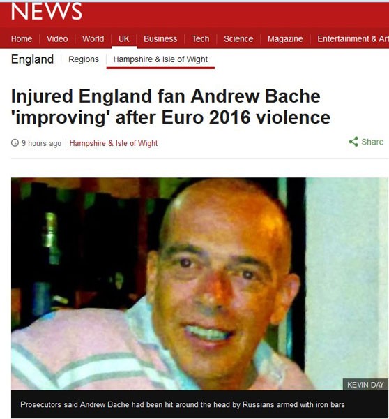 Английский футбольный болельщик Эндрю Беч, получивший обширные повреждения мозга в ходе беспорядков во французском Марселе, вышел из комы. Об этом сообщает британское издание The Daily Star.