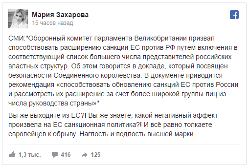 Официальный представитель МИД РФ Мария Захарова прокомментировала в Facebook инициативу оборонного комитета британского парламента расширить санкции ЕС против России.