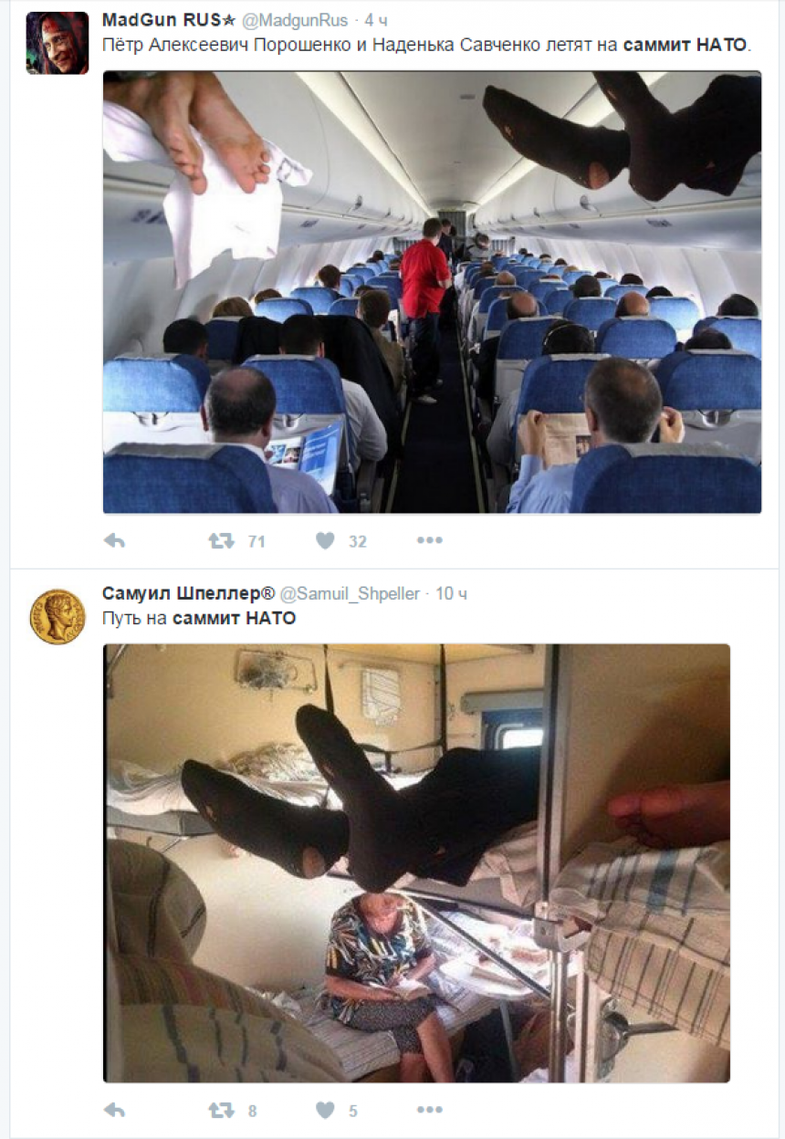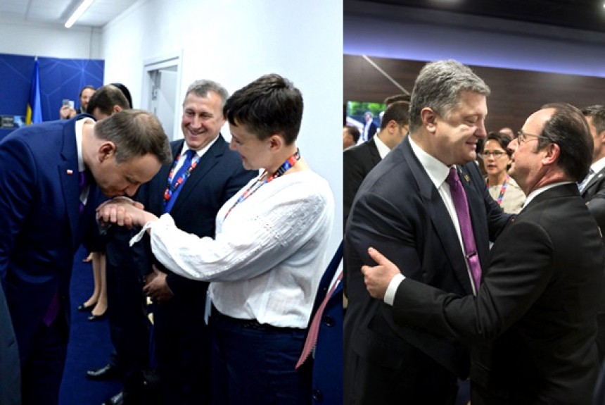 Пользователи социальных сетей активно обсуждают поведение украинского президента Петра Порошенко и депутата Верховной рады Надежды Савченко на саммите НАТО в Варшаве.