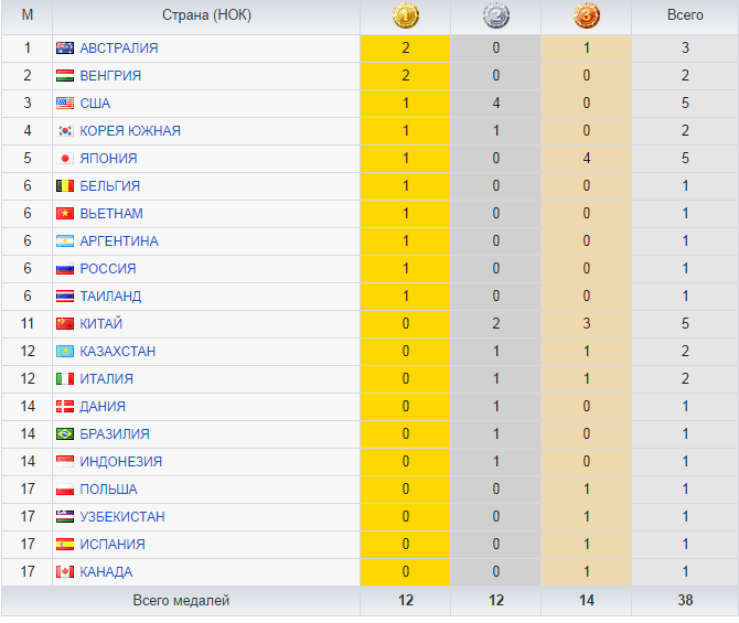 Возглавляет неофициальный медальный зачёт Австралия (2 золотых медали и 1 бронзовая), второе место у Венгрии (2 золотых медали), третье — США (1 золотая медаль и 4 серебряных).