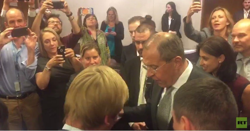 «Чтобы искупить (ха-ха) затянувшуюся уже на 9 часов паузу , вызванную согласованием американской делегацией хода переговоров с Вашингтоном, Керри прислал Лаврову и его команде пиццу. Лавров отнёс её журналистам», — сообщила в своём Facebook представитель МИД РФ Мария Захарова.