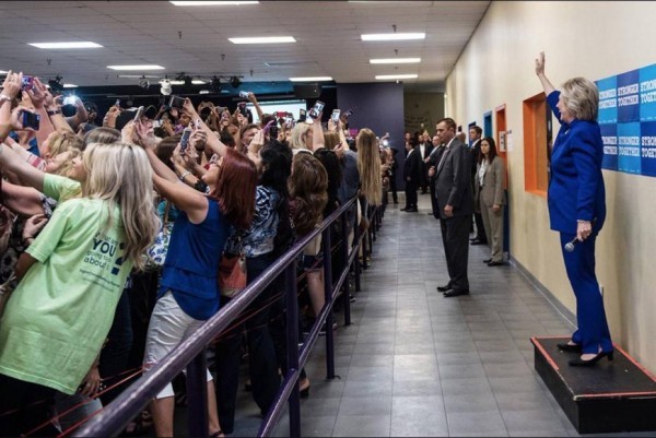 Странное общение Хиллари Клинтон со своими почитателями. Все к ней - спиной, потому что... бросились делать "селфи":