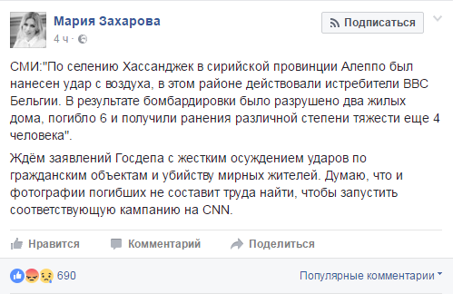 «Ждём заявлений Госдепа с жестким осуждением ударов по гражданским объектам и убийству мирных жителей. Думаю, что и фотографии погибших не составит труда найти, чтобы запустить соответствующую кампанию на CNN», — написала Захарова в своём Facebook.