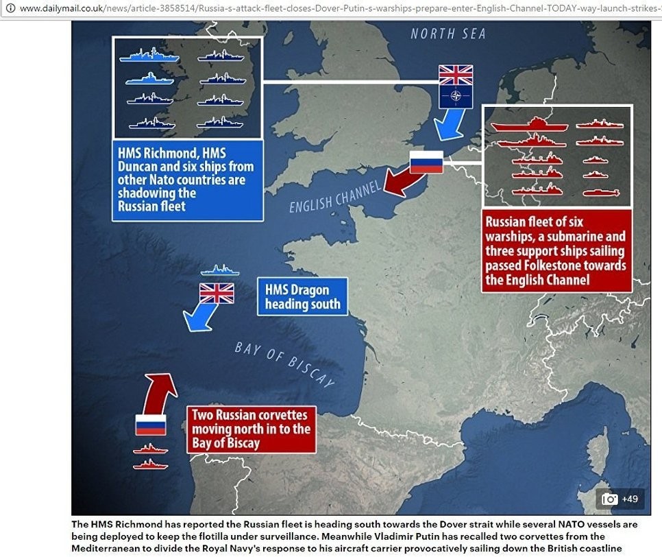 "Русские в нашем поле зрения. Герои королевского флота подкараулили ядерный флот Путина", — вторила The Sun. Когда российские суда, наконец, вошли в Ла-Манш, издание заявило о "вторжении".