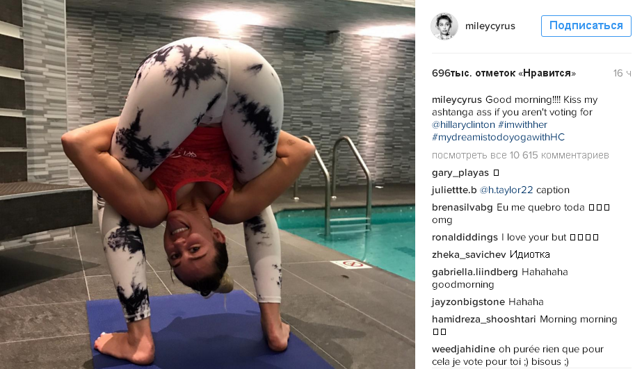 Призыв голосовать за Хиллари Клинтон, сопровождаемый фотографией с занятий йогой и неприличным пожеланием, опубликовала в своём блоге в Instagram 23-летняя американская певица Майли Сайрус. Поп-звезда заявила, что отдавшие свои голоса против кандидата от демократов могут поцеловать её в зад.